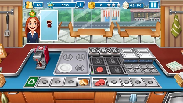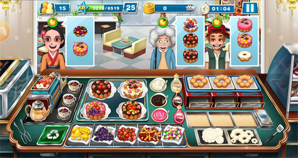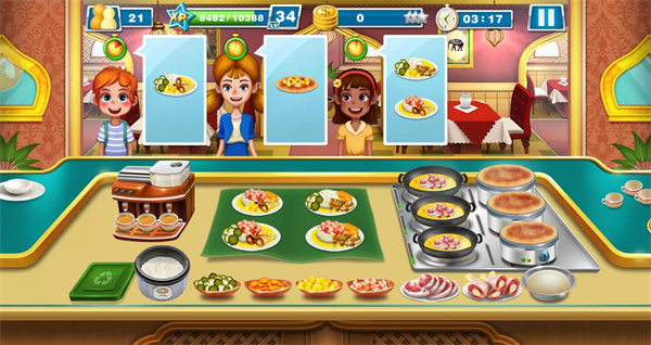 3、進(jìn)入營(yíng)業(yè)后,你的客人會(huì)源源不斷的前來(lái)消費(fèi),此時(shí)你需要根據(jù)顧客的點(diǎn)餐需要來(lái)制作對(duì)應(yīng)的食物,而這里的制作方式是分開(kāi)進(jìn)行的,也就是說(shuō),配料的搭配顯得尤為重要,每一樣順序就更加重要了,若搭配失敗怎么辦?只能將制作好的食物丟掉了,而這將影響顧客的耐心,并有損時(shí)間,限定時(shí)間內(nèi)完不成目標(biāo),將得不到三星評(píng)價(jià),也就意味著玩家要升級(jí)的速率變低。