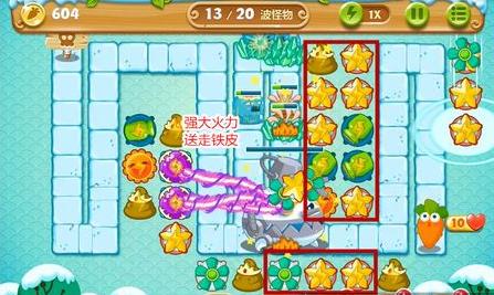 3、鐵皮的前進(jìn)似乎不可阻擋,在鐵皮走到,開(kāi)始在右邊的空地布置火力。瓶子炮、炸彈星各2~3個(gè)。左邊可以放便便塔來(lái)延緩鐵皮行動(dòng),為后場(chǎng)爭(zhēng)取時(shí)間。