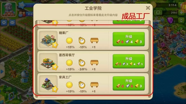 對于成品工廠的升級順序,應(yīng)根據(jù)金屬錠的數(shù)量,優(yōu)先升級物品生產(chǎn)時間較長的工廠,如:糖果廠、造紙廠、果醬廠、家具工廠、墨西哥餐廳等;
