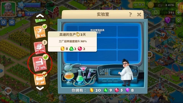 在本階段中,小鎮(zhèn)工廠“生產(chǎn)時間-30%,金幣+25%,工廠貨架+2”的性能,如果再配合實驗室中工廠30%提速生產(chǎn)道具,小鎮(zhèn)工廠的生產(chǎn)時間最終至少節(jié)省50%,這樣的結(jié)果,想一想,小翔都覺得興奮。