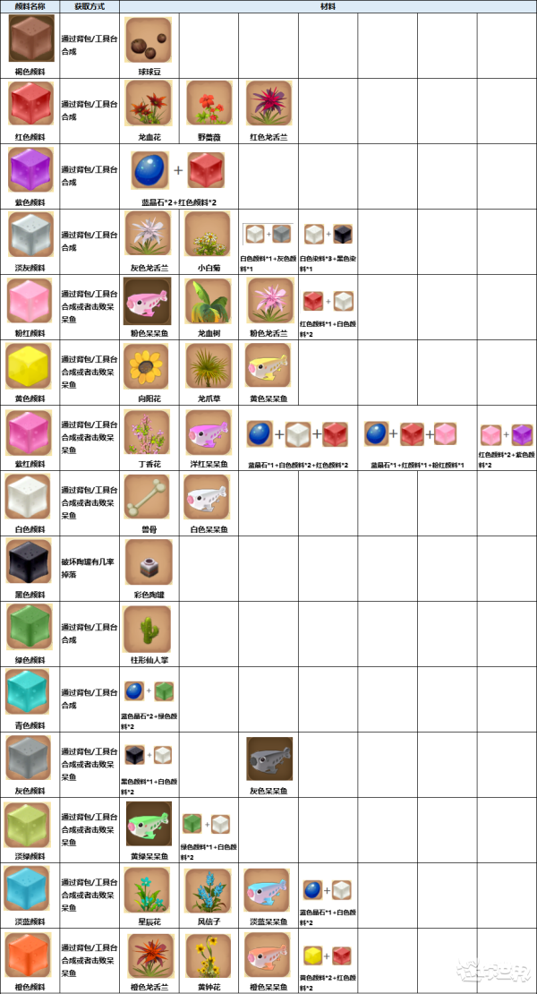 顏料可以通過(guò)背包或者工具箱,對(duì)原材料進(jìn)行分解獲取。以下為小編整理的各色顏料對(duì)應(yīng)表。