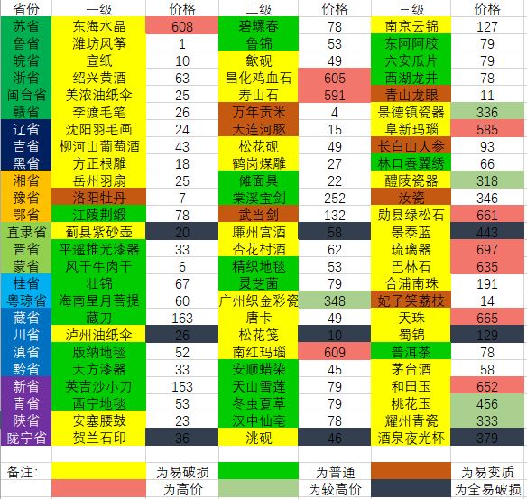 8、圖(4)是跑商核心,標(biāo)紅為收益較高的特產(chǎn),可以看出都是易破損貨物,其中汝瓷被分類(lèi)易變質(zhì)我猜是策劃配錯(cuò)了(如果不是我眼睛問(wèn)題),所以推薦跑易破損特產(chǎn),其中標(biāo)黑為特產(chǎn)全是易破損貨物的省份,可以利用起來(lái)。