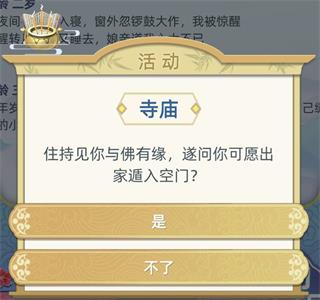 2) 寺廟找住持聊天,有幾率讓你出家(必須持有至少10兩銀子才能見(jiàn)到住持,見(jiàn)住持時(shí)給的錢(qián)越多幾率越大,抓周抓到相關(guān)物品出家?guī)茁试黾樱?br /> 禪師