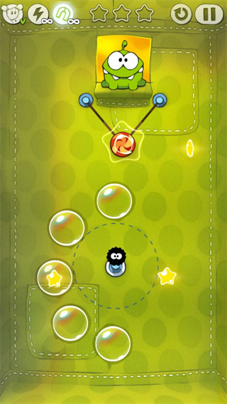 2、泡泡,糖果碰到泡泡的時(shí)候會(huì)上升,用手指點(diǎn)擊泡泡使其破掉,當(dāng)然了,當(dāng)糖果飄出屏幕或者掉落出邊界游戲就結(jié)束了。