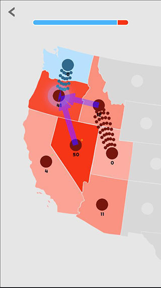 5、你還可以同時(shí)派遣多個(gè)地塊的單位進(jìn)行攻擊擴(kuò)張,具體操作方法是,點(diǎn)擊拖動(dòng)我方圓點(diǎn)至另一個(gè)我方圓點(diǎn),最后再拖動(dòng)至敵方地塊,這樣做可以有效的攻占敵方的地塊。
