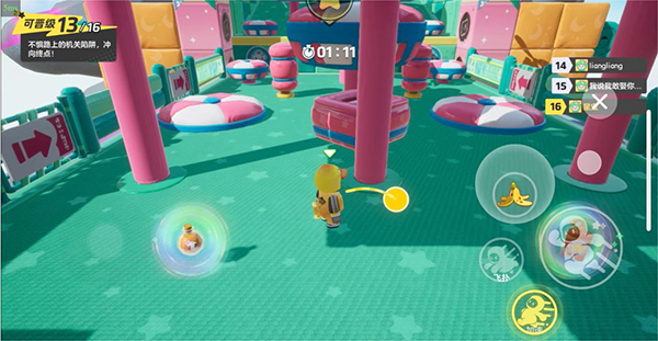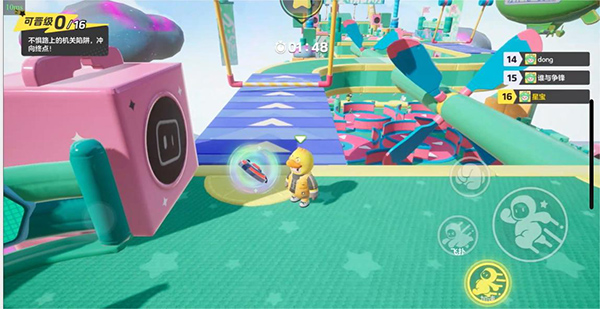 進(jìn)入游戲,操作方面可以說(shuō)跟蛋仔沒(méi)什么差別,左邊輪盤控制移動(dòng),右邊分別為加速、飛撲、跳躍和道具使用。