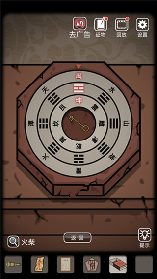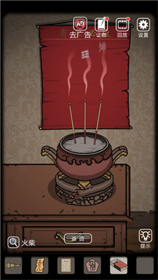 10、接著玩家點(diǎn)擊柜子上的的香爐,插上三根香,隨后使用火柴點(diǎn)燃,可以獲得線索風(fēng)、坤