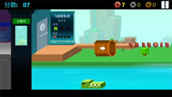 2、飛躍鱷魚(yú)潭:抓準(zhǔn)發(fā)射筒角度變化的時(shí)機(jī),點(diǎn)擊屏幕將小怪獸發(fā)射至終點(diǎn)。