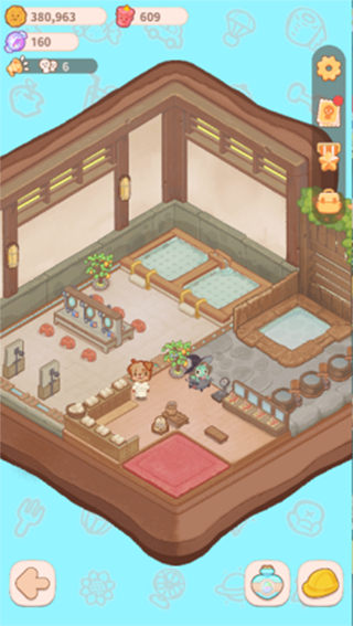 溫泉:一些溫泉有的日常設(shè)施,淋浴、溫泉池、洗漱臺(tái)、毛巾柜,一些設(shè)施具有耐久值屬性,客人互動(dòng)后會(huì)降低耐久值,玩家可點(diǎn)擊補(bǔ)充。