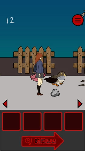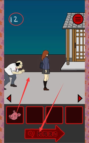 妹子先前進(jìn),然后豬頭丟到妹子身后讓癡漢吃了。再在鳥前面放石頭,妹子經(jīng)過會被石頭絆倒,鳥飛起來,妹子順利回家。