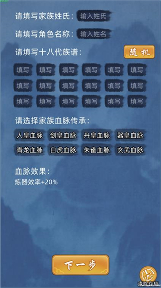 3、根據(jù)玩家自身情況輸入姓氏、名稱以及族譜等信息,選擇好后點擊下一步按鈕。