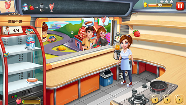 2、在屏幕的左上角會有菜單提醒,告訴我我們顧客所需要的菜單是如何制作的,例如下圖中的飲料,就是需要牛奶和香蕉,然后放如果汁機中就可以獲得。