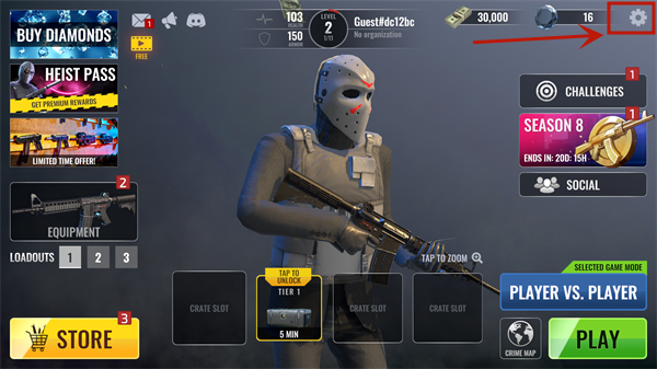 1、進(jìn)入游戲后可以看到游戲默認(rèn)為英文,首先需要點(diǎn)擊右上角的齒輪按鈕進(jìn)入設(shè)置界面