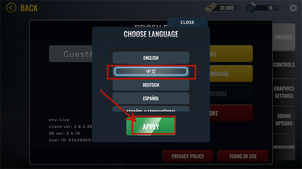 3、在彈出的語(yǔ)言選擇框內(nèi)找到中文,點(diǎn)擊“APPLY”即可完成中文設(shè)置