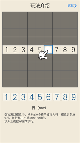 數(shù)獨(dú)游戲棋盤中,橫向的9個(gè)格子被稱為行,棋盤共包含9行,每行都由不重復(fù)的1-9組成。填入正確數(shù)字完成該行。