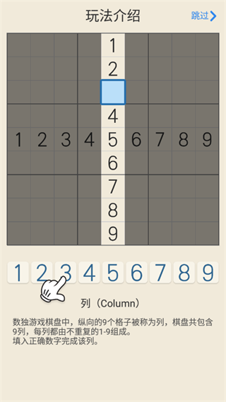 數(shù)獨(dú)游戲棋盤中,縱向的9個(gè)格子被稱為列,棋盤共包含9列,每列都由不重復(fù)的1-9組成。填入正確數(shù)字完成該列。