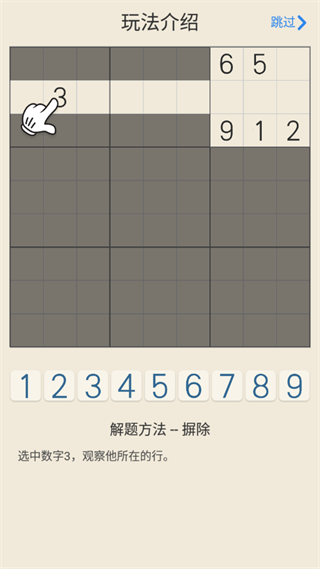 選中數(shù)字3,觀察他的所在行,由于一行只能有一個(gè)3,所以其他單元格不可能是3