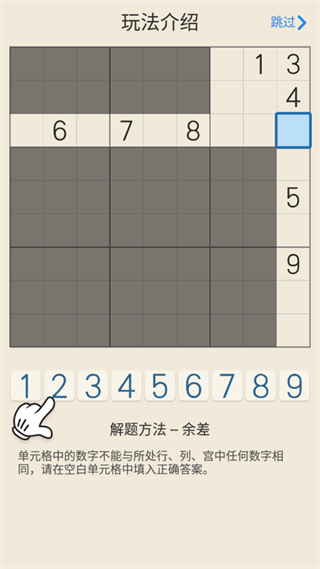 數(shù)獨(dú)游戲棋盤中,用粗線隔開的3x3格子被稱為宮,棋盤共包含9個(gè)宮,每個(gè)宮都由不重復(fù)的1-9組成。填入正確數(shù)字完成該宮。