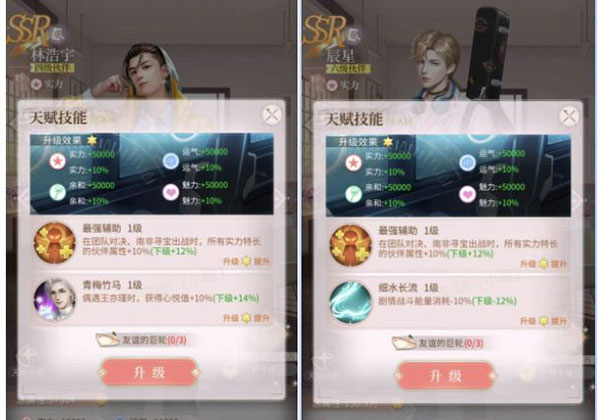 每個SR以上伙伴升級之后會解鎖的天賦技能,SR100級解鎖只有一個,SSR200級還會解鎖一個。每個伙伴技能是不一樣的,會在不同的系統(tǒng)里派上用場。比如說辰星的就是減少能量消耗,這個有點雞肋,前期有劇情榜的時候有用后期就用處不大了。林浩宇的則是和羈絆藍顏偶遇是,心悅值增加10%,如果王亦瑾是你的主養(yǎng)藍顏,那這個加成還是不可小覷的。主養(yǎng)伙伴和主養(yǎng)藍顏一定要搭配好,一個動另外一個也一定要動。藍顏技能加成還是挺可觀的。