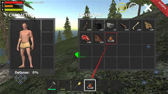 6、搭建完成后,可以在INVENTORY中看到一個(gè)營(yíng)火圖標(biāo),拖動(dòng)這個(gè)圖標(biāo)到石斧等一行的那6個(gè)小框框中。