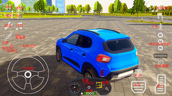 3、點(diǎn)擊play開始游戲,左上角分別是喇叭、天氣選擇、修理車輛、播放音樂、安全帶、左轉(zhuǎn)向燈和右轉(zhuǎn)向燈、故障燈,左下角是車輛方向盤,底部中間是油表和時速表還有地圖,右邊是從上到下分別是視角切換、下車、前進(jìn)檔、空擋、倒車檔、定數(shù)巡航、手剎、剎車和油門。