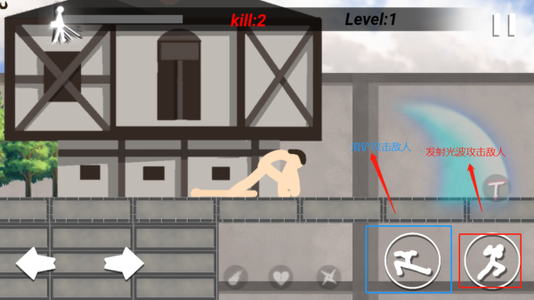 6、在變身巨人的時(shí)期,點(diǎn)擊藍(lán)框標(biāo)志可以滑鏟,點(diǎn)擊紅框標(biāo)識(shí)可發(fā)動(dòng)光波攻擊