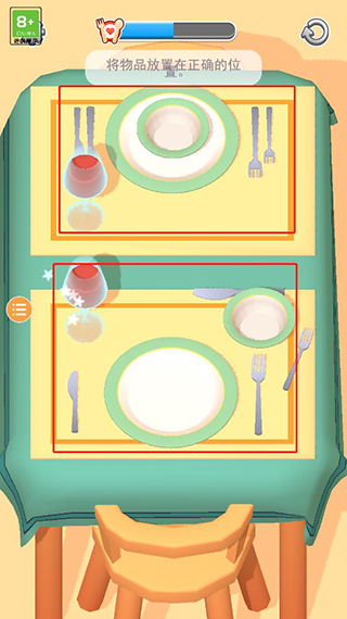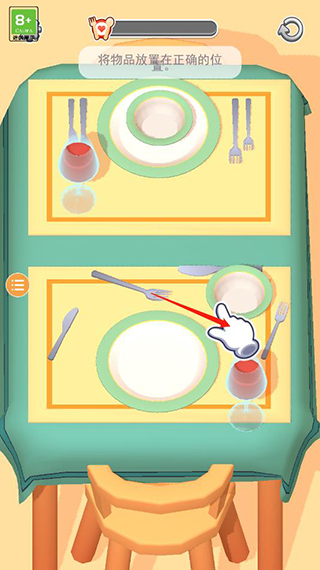1、游戲玩法簡(jiǎn)單,按照關(guān)卡要求完成任務(wù)即可,比如進(jìn)入游戲第一關(guān)就是將物品放置在正確的位置,點(diǎn)擊移動(dòng)餐具重新擺放;