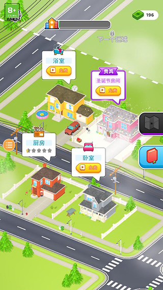 6、游戲場(chǎng)景豐富,有浴室、廚房、臥室、圣誕節(jié)房間等等,隨著游戲的進(jìn)行還能解鎖更多區(qū)域;