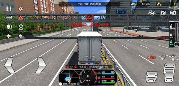 5、在運(yùn)輸過(guò)程中,玩家通過(guò)下方地圖導(dǎo)航至運(yùn)輸終點(diǎn),但在運(yùn)輸途中注意系好安全帶(安全帶時(shí)剎車上方的紅色圖標(biāo)),并且不要違反交通規(guī)則、以及撞車等,不然不僅會(huì)返款扣錢,還會(huì)造成貨損;