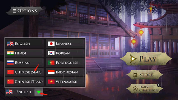 1、游戲初始為英文,點(diǎn)擊左下角的語言選擇,然后切換CHINESE;