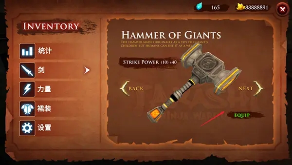 3、這兒就是劍、力量、裙裝的配飾詳細(xì)介紹,點(diǎn)擊EQUIP你可以換上新的武器與裙裝;