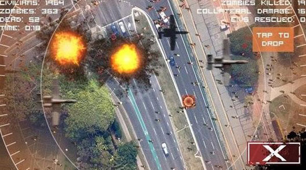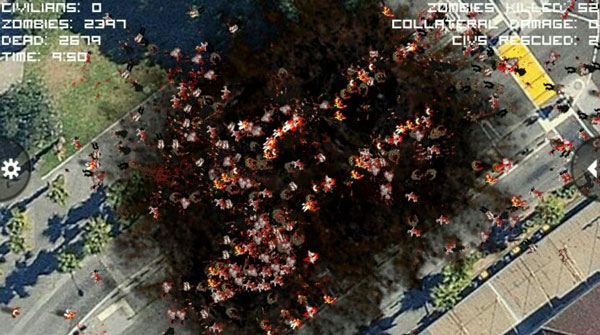 游戲打開就是這樣一幅衛(wèi)星地圖,不像Osmos一樣你控制其中一個(gè)人或者僵尸慢慢成長(zhǎng),你無(wú)能為力。身為旁觀的上帝,世上萬(wàn)物都是自己的子民,他可以看著人類為了溫飽屠殺牲畜,如今也不會(huì)介入僵尸和人類的戰(zhàn)爭(zhēng)。此游戲用了google的衛(wèi)星地圖,房屋上的瓦片,汽車,樹木等物體都清晰可見。應(yīng)用中沒(méi)有人類穿紅色的衣服,紅色成了區(qū)分人類和僵尸的標(biāo)志。