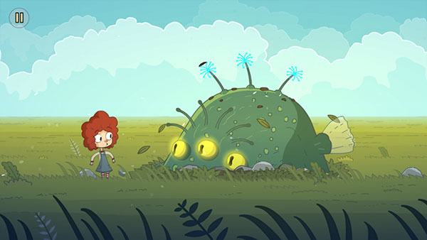 7、繼續(xù)向右,三個(gè)花朵點(diǎn)亮出現(xiàn)三只眼怪獸,點(diǎn)擊它,小女孩會(huì)撫摸它。