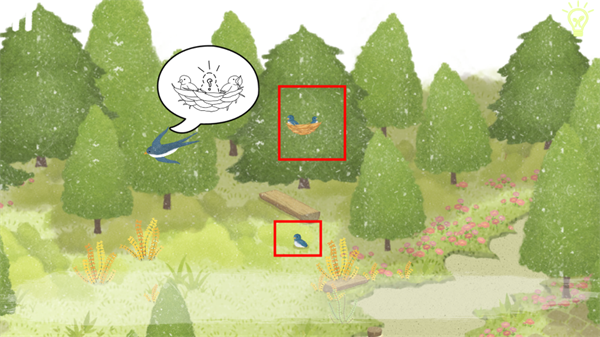 點(diǎn)擊地上紅框處的小燕子,接著在左下物品欄拖動“小燕子”給紅框處的鳥,成功幫助到了燕子?jì)寢?。獲得了“燕子羽毛”。