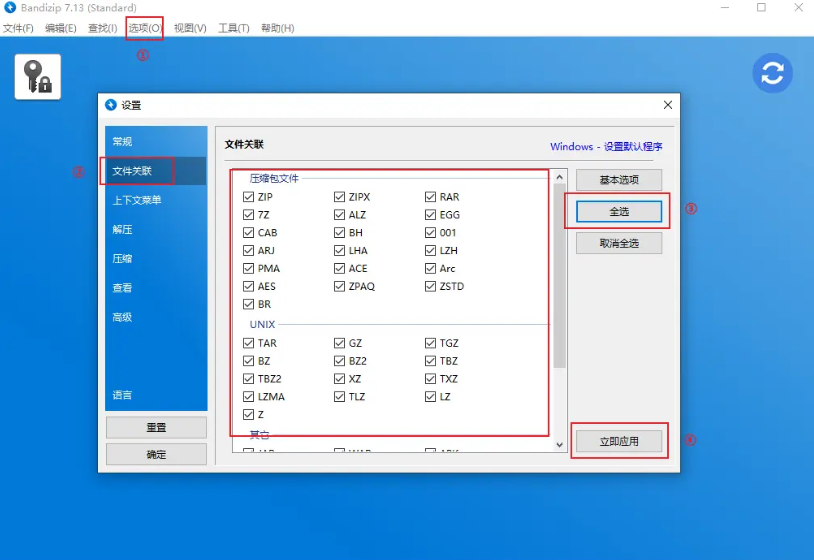 Bandzip支持主流的.zip、.7z、.rar、.tar,還有一些不常見(jiàn)的壓縮格式,如:iso(鏡像文件),總之夠用了。如果你想讓這些格式的壓縮包,默認(rèn)用 Bandzip 打開(kāi)的話(huà),需要在 Bandzip 上設(shè)置關(guān)聯(lián)格式即可,具體做法如下:(1)運(yùn)行Bandzip->點(diǎn)擊“選項(xiàng)”->點(diǎn)擊“文件關(guān)聯(lián)”->點(diǎn)擊要關(guān)聯(lián)的文件格式->點(diǎn)擊“立即應(yīng)用”