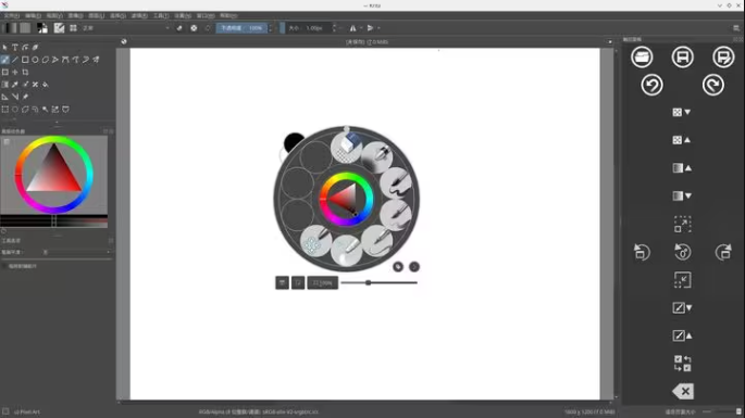 右鍵:在畫布上彈出圓形的多功能面板,上面顯示了色環(huán)、常用筆刷、筆刷分組加載、顏色歷史、筆刷常用屬性滑動(dòng)條,也包括了縮放、旋轉(zhuǎn)、鏡像顯示、隱藏工具面板的虛擬按鈕。