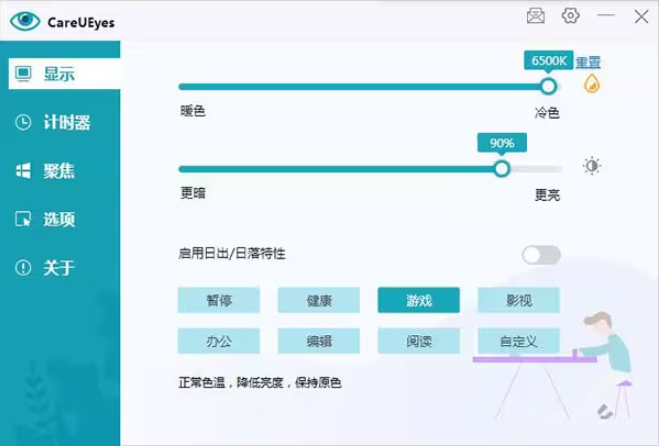 3、CareUEyes具有多種預(yù)設(shè)模式,如普通、智能、辦公、游戲和夜晚模式,可以根據(jù)不同場(chǎng)景調(diào)節(jié)屏幕的色溫和亮度,使其更適合你的使用需求。此外,它還擁有定時(shí)器和提醒休息功能,可幫助你更好地管理工作時(shí)間,避免過(guò)度用眼。