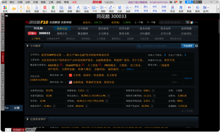 對(duì)炒股的人來(lái)說(shuō),他們要關(guān)注很多的信息,除了企業(yè)的基本盤(pán)以外,還要關(guān)注行業(yè)的各個(gè)信息,同時(shí)炒股的人員也在不斷的選股,希望能夠選擇一個(gè)價(jià)值高的股票。而同花順這樣的軟件就提供了豐富的功能,在同花順中有各種資訊,有短時(shí)資訊,也有長(zhǎng)期資訊的分析,還有政策分析。同時(shí)在同花順中隨意的搜索一個(gè)股票代碼,就可以出現(xiàn)股票的變換趨勢(shì)以及公司的詳細(xì)信息,可以說(shuō)功能非常的豐富。