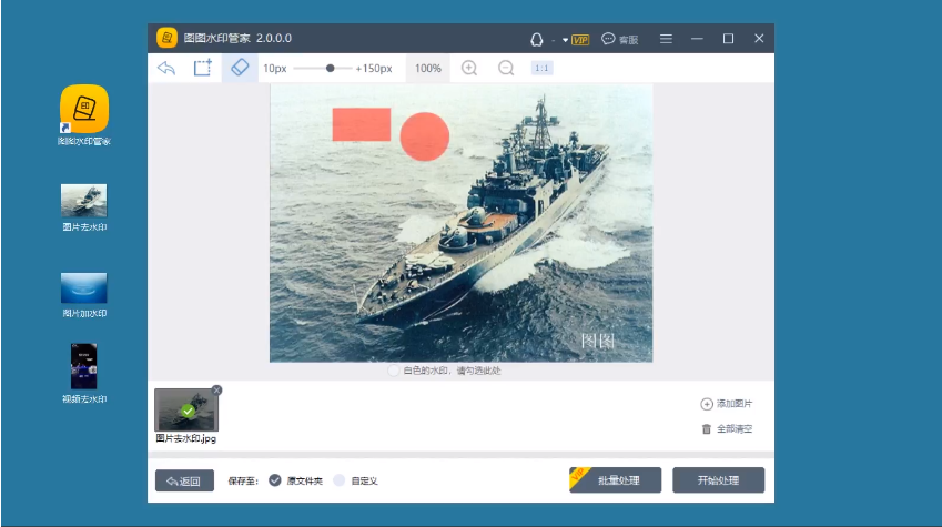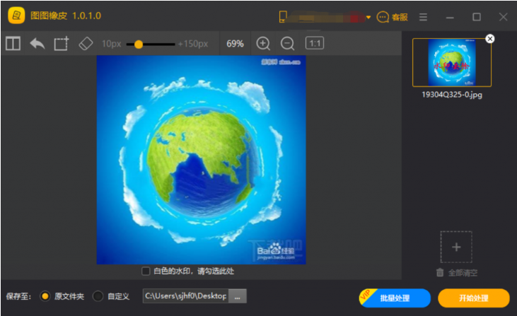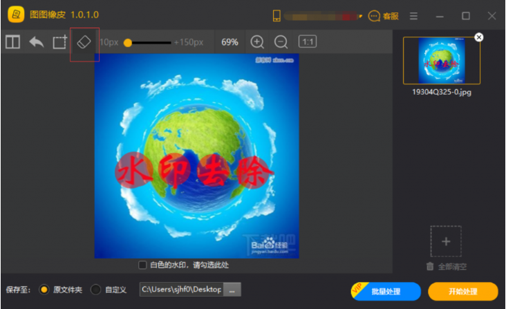步驟二:選擇工具“橡皮擦”,可根據(jù)操作需要調(diào)整橡皮擦大小和縮放圖片。擦涂水印,點(diǎn)擊“開始處理”。