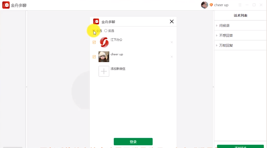 金舟多聊是一款專業(yè)的電腦微信多開輔助工具,能夠在同一電腦上同時(shí)登陸多個(gè)微信賬號。不限登錄數(shù)量,一鍵批量登錄多個(gè)賬號,提高辦公效率。軟件還支持創(chuàng)建話術(shù)列表,云端上傳/下載話術(shù),信息同步更方便!聊天過程實(shí)時(shí)鎖定聊天界面,防止聊天內(nèi)容泄露,電腦辦公更安全!