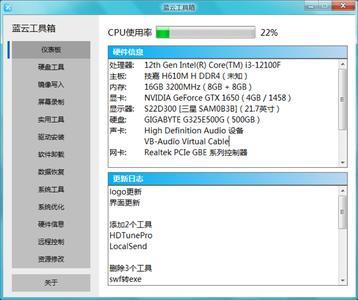 打開藍云工具箱,能看到所有的分類菜單在主界面左側(cè),分為硬盤工具、鏡像寫入、屏幕錄制、驅(qū)動安裝、軟件卸載、數(shù)據(jù)恢復(fù)等十幾個大類。