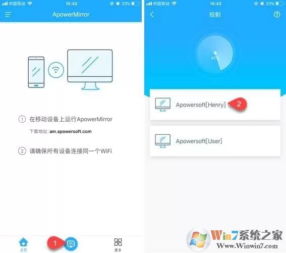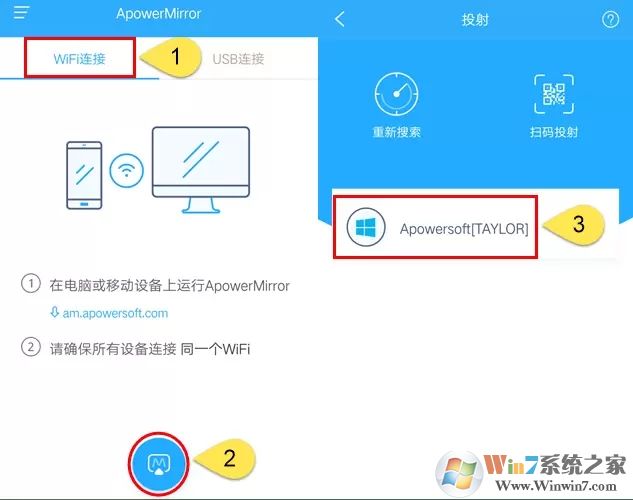 3、開啟APP,點擊投射圖標(biāo),掃描可用的設(shè)備。選擇“Apowersoft”的電腦設(shè)備,點擊“立即開始”。