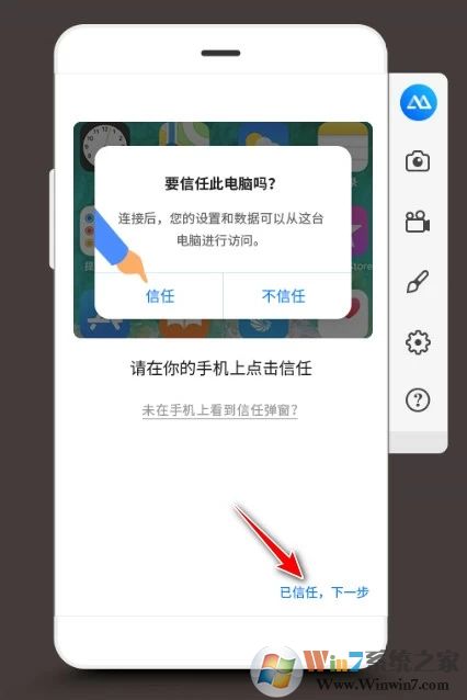 3、如果您是首次使用USB線連接電腦,在手機或平板上會出現(xiàn)一個“信任此電腦”的彈窗,點擊“信任”后,在PC端傲軟投屏上點擊“已信任,下一步”;