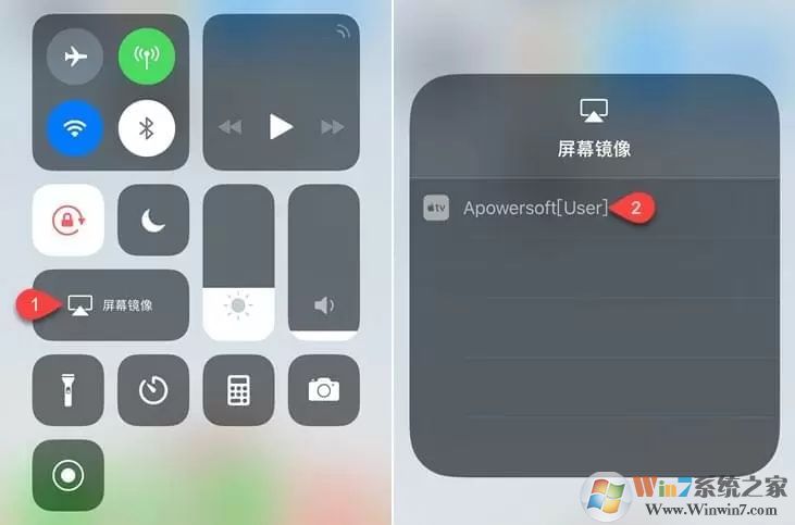4、在iPhone主屏自下向上滑動,iOS 11系統(tǒng)的用戶,點擊“屏幕鏡像”之后,選擇“Apowersoft”名稱設(shè)備;如果您是iOS 10系統(tǒng)及以上,點擊“AirPlay鏡像”后,選擇“Apowersoft”選項。
