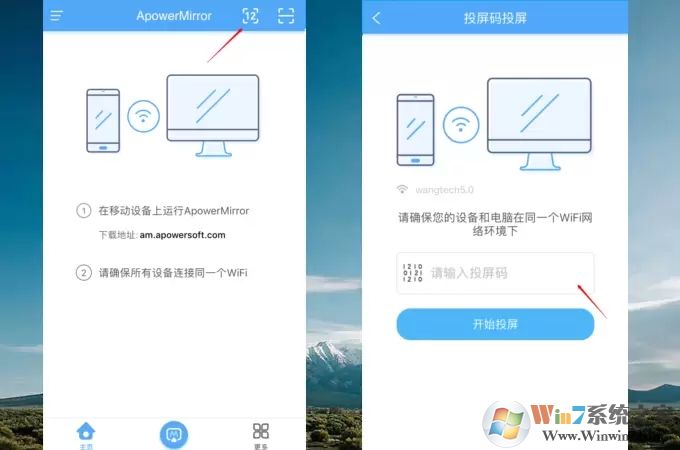 3、打開安卓手機或iPhone上的應(yīng)用程序,點擊右上角的【數(shù)字】按鈕。在手機上輸入電腦顯示的投屏碼。然后,你的手機就會成功投屏在電腦上了。