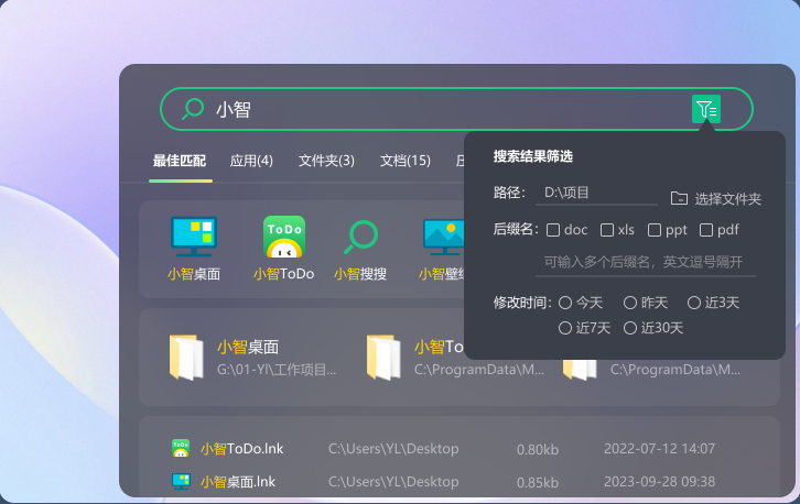 2、小智桌面所涉功能廣泛,包括一鍵桌面整理、桌面內(nèi)容同步到主面板、快速搜索本機(jī)文件/應(yīng)用、創(chuàng)辦代辦事項(xiàng)、分區(qū)任意合并拆分等。