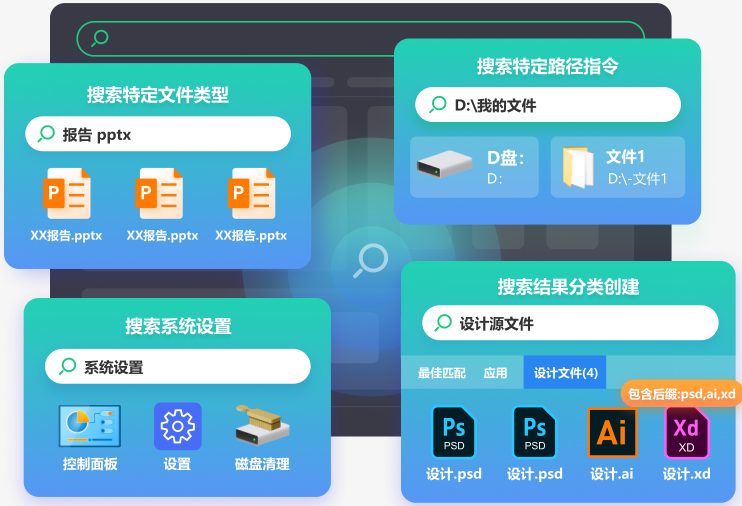 3、搜索結(jié)果精準(zhǔn)至系統(tǒng)設(shè)置,搜索技巧多達(dá)7種,搜縮結(jié)果自定義分類。