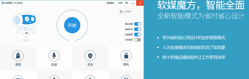 歷經(jīng)Vista優(yōu)化大師、Win7優(yōu)化大師發(fā)展而來(lái),軟媒魔方6支持64位和32位的所有主流Windows系統(tǒng),從優(yōu)化大師發(fā)展為一款系統(tǒng)增強(qiáng)套裝,自動(dòng)化、智能化解決各種電腦問(wèn)題。軟媒魔方內(nèi)置20余款強(qiáng)大、綠色化的知名組件,清理、美化、桌面增強(qiáng)、系統(tǒng)雷達(dá)、通知區(qū)萬(wàn)年歷、優(yōu)化加速、安全守護(hù)、軟件管家、電腦醫(yī)生、虛擬光驅(qū)、U盤(pán)裝機(jī)等等。