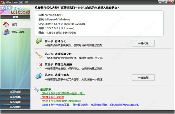 Windows優(yōu)化大師深入系統(tǒng)底層,分析用戶電腦,提供詳細準(zhǔn)確的硬件、軟件信息,并根據(jù)檢測結(jié)果向用戶提供系統(tǒng)性能進一步提高的建議。