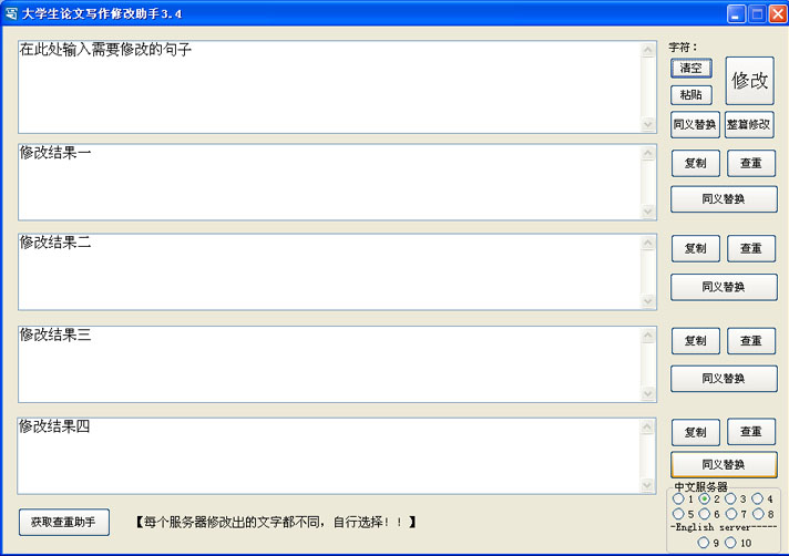 論文查重后一般多少都有一定的重復(fù)率,這時(shí)候就需要把重復(fù)的句子進(jìn)行修改,如果你想提高工作效率、拓展思路的話,建議你使用我們的論文修改助手,此軟件可以把一個(gè)句子改造成四個(gè)句子,供你選擇。同時(shí)也提供整篇修改,速度更快,效率更高!